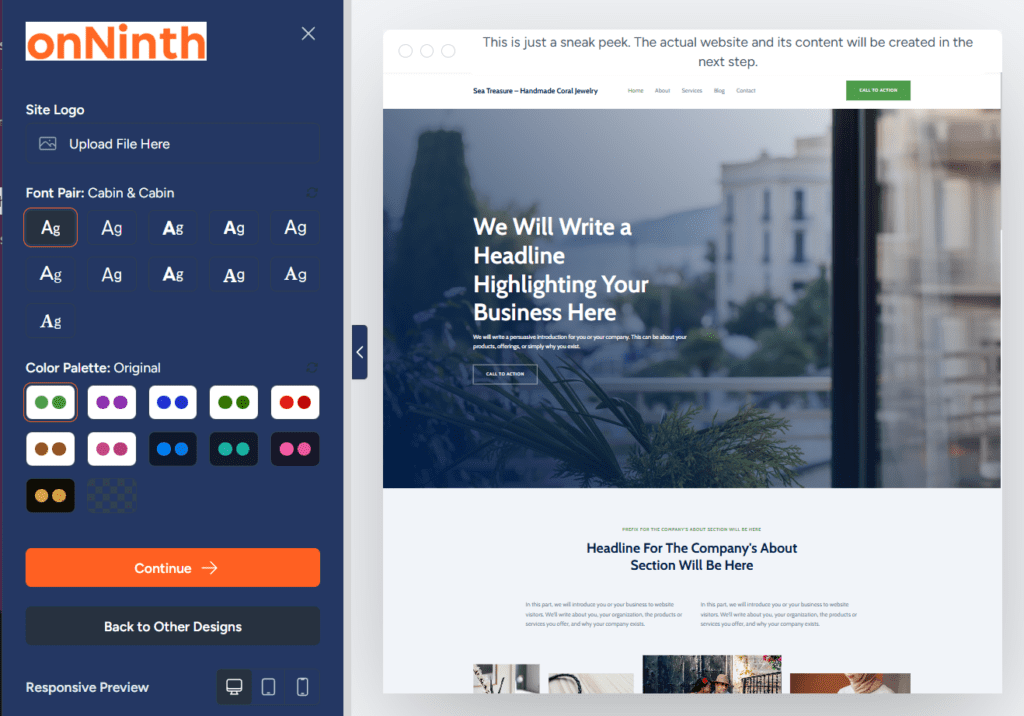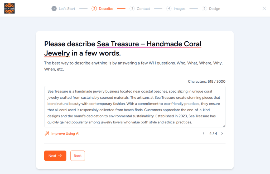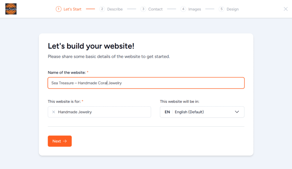 Add your business name and type (for example: “Sea Treasure – Handmade Color Jewelry”). This helps onNinth AI Builder understand your niche and create relevant layouts.