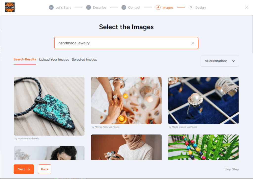 onNinth AI Builder suggests high-quality, niche-relevant stock photos using AI image search. Pick the ones that fit your brand or upload your own visuals. If you’re still not satisfied with the suggested results, you can continue to refine your visuals with an AI-powered image editor to achieve a more polished and impressive final image. Pro tip: Try changing keywords to get new photo suggestions. You can also upload your photos at this step (Upload Your Images – Next to Search Results). AI will use these photos to build out the site. Do not upload your full gallery yet. Add 10-15 total that highlight your brand, which could include local attractions, views from your home, etc.