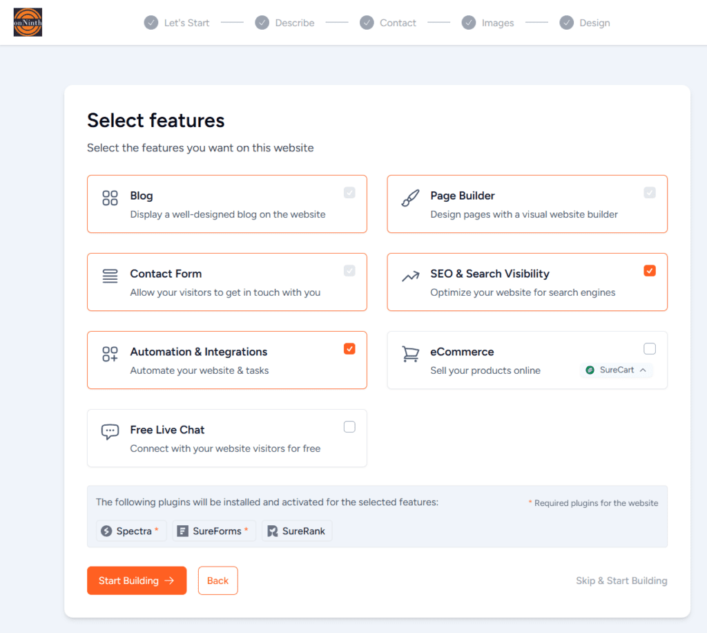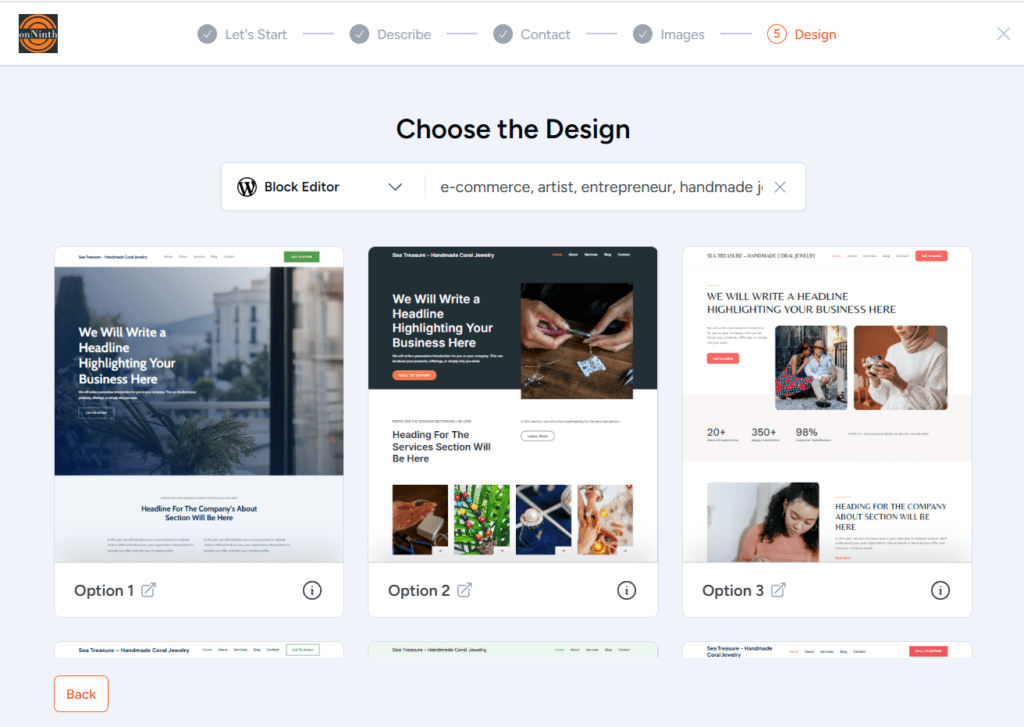 The AI instantly generates dozens of responsive layouts using drag-and-drop WordPress builders like Spectra. You can preview homepage sections, view included plugins, and filter designs by business type. Choose one, tweak the colors or fonts, and upload your logo.